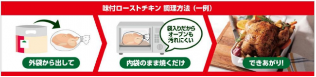 「オーブンバッグ&トレー」商品は、耐熱性の内袋やトレーごとにあらかじめカットされた食材を簡単な手順で下準備をした後、オーブンに入れて加熱するだけででき上がる。素材の旨みや水分を逃がさず、ムラなく焼き目がつきながらもしっとり、ジューシーに焼き上がるのが特徴。また、内袋やトレーのまま加熱することで庫内が汚れにくくなるため、後片付けも楽だ。