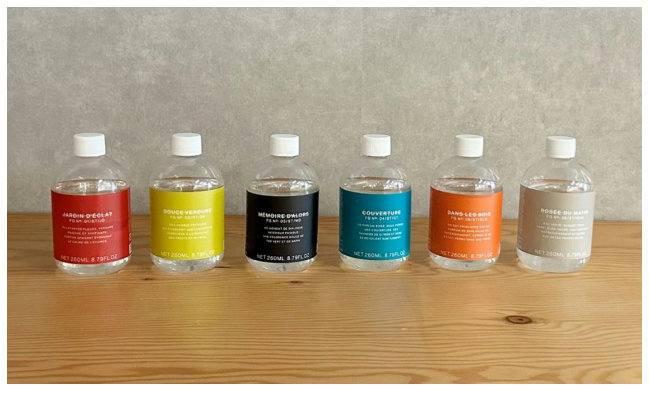 「アロマディフューザー」は130mlでそれぞれ販売価格は500円(以下同)。香りは、上段左から、みずみずしく爽やかなグリーンと静かな樹皮を感じる「Jardin d’Éclat ジャルダン・デクラ 輝く庭」、フレッシュなハーブと果実やはちみつのやさしさを感じる「Douce verdure ドゥース・ベルデュール やさしい緑、穏やかな緑」、穏やかなグリーンティやモミの香りの「”Mémoire d’alors メモワール ダロール あの頃の思い出」。