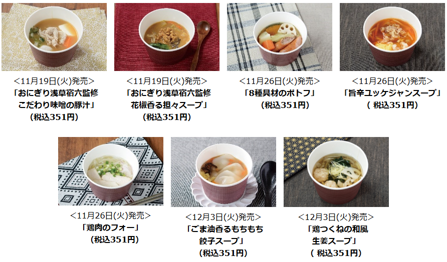 昨年より種類を2品増やし、和・洋・中・エスニックの選べる7品を品揃えする。11月19日(火)発売の「おにぎり浅草宿六監修 こだわり味噌の豚汁」と「おにぎり浅草宿六監修 花椒香る担々スープ」2品は、おにぎり専門店「おにぎり浅草宿六」がコンビニエンスストアのオリジナル商品としては初めて監修した商品だ。