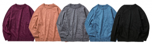 程よいハリ感とストレッチ性を併せもったミラノリブニット。上品な印象を与えるきれいなニットセーターなのにスウェット感覚のラクな着心地。カラーはワイン・ウォームオレンジ・チャコール・ブルー・ブラック、サイズはM・L・LL、価格は1900円(税込み、以下同じ)。