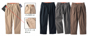 ストレッチ性があるので、着心地は抜群。ウォッシャブル。6つポケットとカラビナループが付いている。カラーはサンドベージュ・ダークネイビー・ヘリンボングレー・ヘリンボンブラウン、サイズはM・L・LL、価格は2500円。
