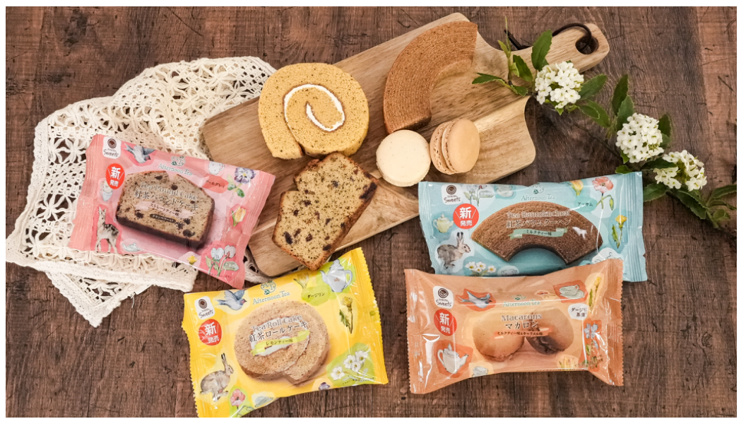 左から、ミルクティーと相性のいいアッサムを使ったコクのあるミルクティー味の「紅茶バウムクーヘン ミルクティー味」本体価格174円(以下同)。アールグレイの風味をしっかり感じるように茶葉とペーストを使って焼き上げた「紅茶パウンドケーキ ストレートティー味」158円。ダージリンの優しい味わいの紅茶生地にレモンピール入りのレモンクリームを巻き込んだ「紅茶ロールケーキ レモンティー味」164円。生地にダージリン茶葉を使ったミルクティー味と、キャラメルソースを使ったキャラメル味の2種セットの「マカロン ミルクティー味&キャラメル味」268円。