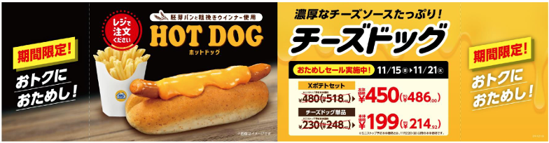 チーズドッグ発売を記念して、199円のおトクなお試しセールを7日間限定で開催する。同時にチーズドッグとの「Xポテトセット」も480円のところ450円で販売する。