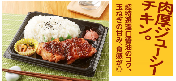 「チキンステーキ(和風オニオン)弁当」は肉厚ジューシーなチキンステーキに、玉ねぎの具材感と超特選濃口醤油のコクが特長的な和風オニオンソースを合わせて仕上げた。