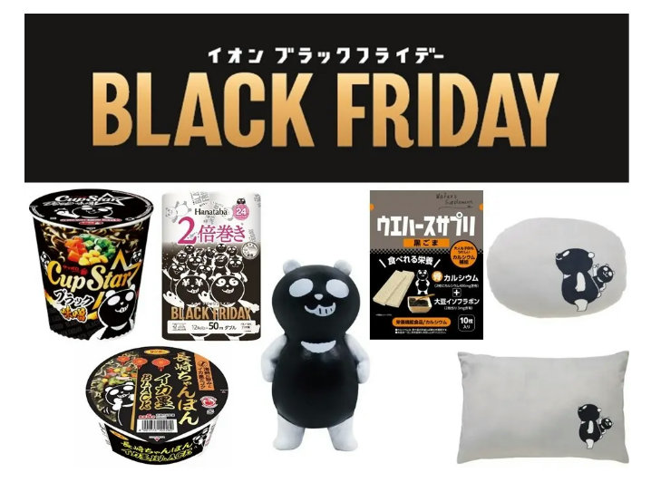 9年目となる今年の「イオン ブラックフライデー」では、食品や衣料品、暮らしの品など厳選した商品を展開している。さらにセールを楽しんでもらうため、「イオン ブラックフライデー」のオリジナルキャラクター「ブラックパンダ」商品をはじめ、黒をモチーフとした様々な商品を展開する。