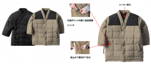和を感じられる半纏タイプ。中わた入りで、発熱・保温機能が付いている。サイズは S・F(フリー)、カラーはブラック・ベージュ、価格は4900円(税込み、以下同じ)。