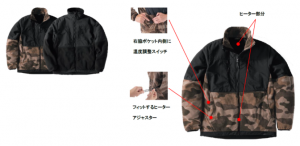 軽くて暖かい。柔らかなフリースとヒーターの掛け合わせで外での着用はもちろん、室内着としてもおすすめ。保温・発熱機能が付いている。サイズはM~LL、カラーはブラック・カモフラブラウン、価格は4500円。