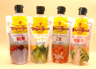 この取り組みの一環として、愛知県名古屋市に本社を置き、関東・東海・関西エリアにレストランを展開するブロンコビリーと協力。店でも親しまれている4種類のドレッシングを家庭でも手軽に味わえるように、パウチタイプの容器で商品化した。