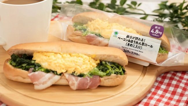 「鉄分が摂れる!ベーコン&ほうれん草ロール」は、1個で鉄分4.8mgが摂れる商品になっている。ほうれん草とベーコン、さらに数種類のきのこを挟み、鉄分量だけでなく、おいしさにもこだわったロールサンドを開発した。