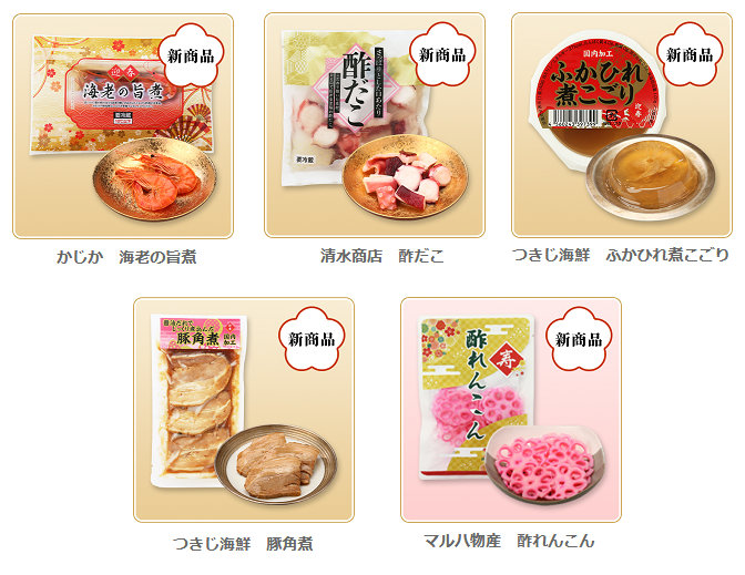 「かじか 海老の旨煮」は、縁起物として髭の長さやツノのカットなど、いい海老の条件を指定したブラックタイガーを使用。本体価格300円(以下同)。「清水商店 酢だこ」300円は、新鮮な真蛸を使用し、天日原塩でしっかりと塩もみをし、旨味を凝縮。自社ブレンド酢でさっぱりとした酸味に仕上げた。「つきじ海鮮 ふかひれ煮こごり」200円は、北海道産利尻昆布と濃口醤油を使用し、煮凝りで仕上げた一品。「つきじ海鮮 豚角煮」200円は、タレが肉の中まで味染みする様に手作業で丁寧に下処理。自家製特製だれでじっくり煮込み、味がしっかり染み込んだ柔らかな豚角煮。「マルハ物産 酢れんこん」150円は、香り・味にクセの無い醸造酢を使用し、撫子(なでしこ)の花のような少し紫みのある薄い赤色を表現した酢漬の花れんこん。