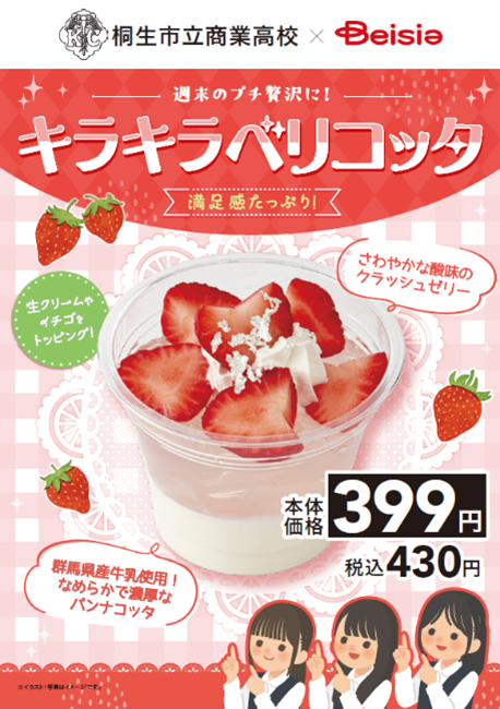 (株)ベイシア(群馬県前橋市、相木孝仁社長)は桐生市立商業高等学校と共同開発したスイーツ「キラキラベリコッタ」を、11月30日(土)、12月1日(日)、7日(土)、8日(日)の週末に期間限定発売する。販売する店舗は、ベイシア西部モール店、ベイシア前橋小島田店、ベイシア Foods Park新里店、ベイシア Foods Park太田丸山店の4店。