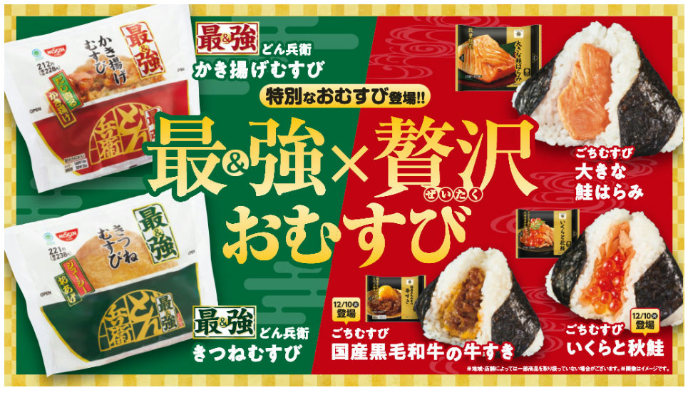 (株)ファミリーマート(東京都港区、細見研介社長)は12月3日(火)、日清食品(株)(東京都新宿区、安藤徳隆社長)の「日清の最強どん兵衛」とコラボレーションした「最強どん兵衛おむすび」と、贅沢な具材を使用した「ごちむすび」シリーズを、全国のファミリーマート約1万6300店で発売する。