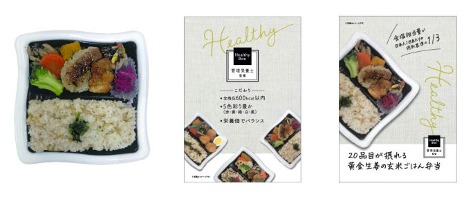 「20品目が摂れる黄金生姜の玄米ごはん弁当」は、7種類の食材を使用したまごわやさしいハンバーグ・きのこ炒め・にんじんグラッセ・豆ひじきサラダ・ブロッコリー などのバラエティ豊かなおかずに、生姜の辛味成分が多い黄金生姜を炊き込んだ生姜の風味が香る玄米ごはんを詰め込んだ弁当となる。赤・黄・緑・白・黒の5色を意識した彩りで、600kcal以内の弁当に仕上げている。