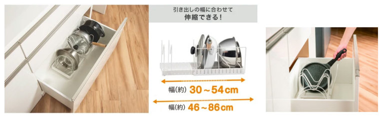 「伸縮フライパンスタンド」は、スタンドの横幅を伸縮させて引き出しの幅にぴったり調整でき、収納スペースに合わせて設置可能な商品だ。
