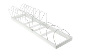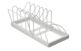 「伸縮ザルボウルフライパンスタンド 伸縮幅30-54cm」は、サイズ(約)が幅30.3~54.3cm×奥行20.6cm×高さ16.9cmで、1490円(税込 以下同)。カラーはホワイト。