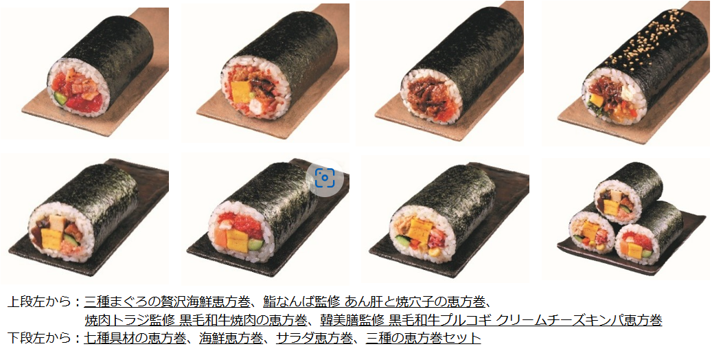 2024年の恵方巻では、寿司店や焼肉店が監修した高付加価値な商品の販売が2023年対比で約2倍と需要があったことから、2025年でも具材やバランスにこだわった付加価値の高い恵方巻と定番商品の計10品を発売する。
