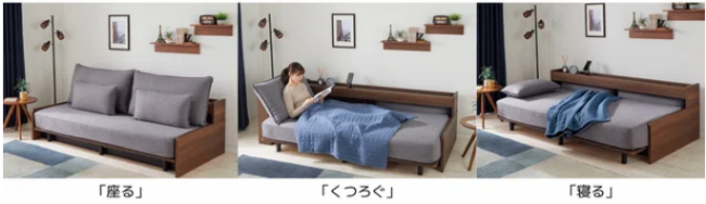 1台で「座るくつろぐ寝る」3通りの使い方ができる。座面にポケットコイルマットレスを使用することで、座り心地のよいソファとしての機能に加え、座面を手前にスライドすればシングルベッドとして利用できる。