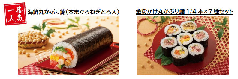 2025年恵方巻は、6種の海鮮具材を使った一番人気の「海鮮丸かぶり鮨(本まぐろねぎとろ入)」や、手軽な価格で恵方巻を楽しみたいという要望に対応した、予約対象商品の「惣菜恵方巻のハーフサイズ」など。店頭とネットショップそれぞれで予約特典を用意して、予約を受注を促す。