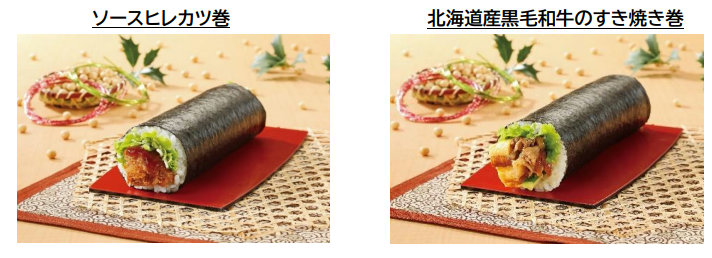 幅広い層に人気の「ソースヒレカツ巻」は、肉厚のやわらかいヒレカツを巻いたボリューム満点の恵方巻。ハーフは498円、1本980円。「北海道産黒毛和牛のすき焼き巻」は、黒毛和牛の牛すき煮を中具にした恵方巻。ハーフは698円、1本1280円。