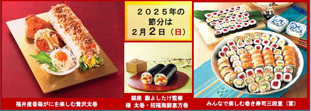 2025年の節分は日曜日となることから、週末の節分にあわせて「みんなで楽しむ巻き寿司三段重」「具材を食べる太巻」といった、シェアすることでお得に楽しめるセット商品を充実させる。