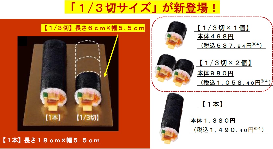 また、「具材たっぷりの太巻を丸ごと全部食べるのは困難」「少しずつ味わいたい」といったニーズに応えて、例年人気の銀座「鮨よしたけ監修」太巻2品目は1/3サイズを用意する。1/3サイズの太巻を販売するのはイオンリテールでは初となる。
