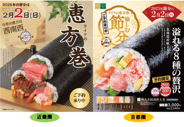 (株)ライフコーポレーション(東京本社:東京都品川区、大阪本社:大阪市淀川区、岩崎高治社長)は、2025年恵方巻の予約販売を開始した。2025年の節分は2月2日(日)。