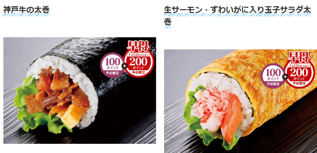 一方、首都圏の予約販売商品は、「極太幸福海鮮太巻」3000円、「国産生本鮪三昧太巻」2980円、「神戸牛の太巻」2380円、「生サーモン・ずわいがに入り玉子サラダ太巻」1580円など7種類を用意する。