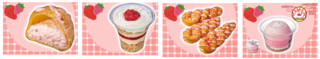 主な品揃えは12品目。いちごの果肉入りクリームを詰め込んだ「いちごのシュークリーム」(190円税抜き以下同)や、パイ生地とホイップをミルフィーユ状に重ねたカップタイプの「いちごのカップミルフィーユ」(320円)、ツイストドーナツにいちごチョコをかけた「いちごチョコがけツイストドーナツ」(168円)など。