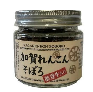 加賀野菜の加賀れんこんに玉葱、生姜、能登牛そぼろを合わせ、金沢大野醤油と鰯魚醤でじっくり煮込んで仕上げたそぼろ。75gで458円。