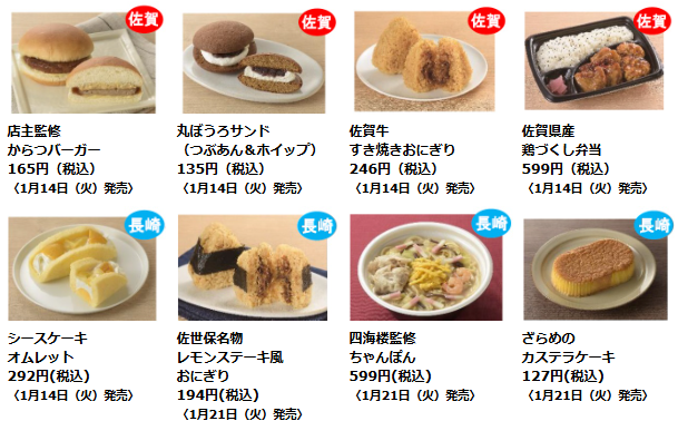 佐賀県唐津市のからつバーガー監修商品や佐賀のご当地銘菓をイメージしたスイーツなどや長崎県佐世保市の名物料理をイメージしたおにぎりや長崎「四海楼」監修のちゃんぽんなどがラインアップされている。