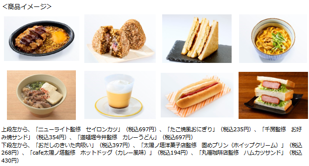 展開メニューは大阪の人気店「ニューライト」、「千房」、「道頓堀今井」、「太陽ノ塔」、「丸福珈琲店」監修の商品や、大阪のご当地メニューをイメージした商品など8品を発売している。「ニューライト監修 セイロンカツ」(697円 税込 以下同)、大阪名物のたこ焼をイメージした「たこ焼風おにぎり」(235円)、「千房監修 お好み焼サンド」(354円)など。