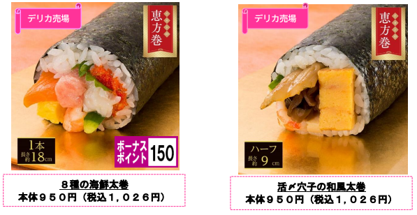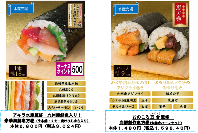 水産売場6品目、惣菜売場8品目を揃える。例えば、水産売場では、福岡市中央卸市場の仲買であるアキラ水産から仕入れた九州産のくえやひらまさなどこだわりの海鮮を使用したアキラ水産監修「豪華海鮮恵方巻」(予約価格2800円税抜)をはじめ、とろける煮穴子1枚を贅沢に使用した恵方巻がハーフセットになった福岡市の名店おのころ五合はんじょう監修「海鮮創作恵方巻」(1480円)などを揃える。