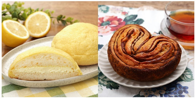左「スイートレモンパン」は、映画のタイトルを彷彿させる甘酸っぱい恋をイメージした、レモン風味のホイップをサンドした、スイートで爽やかなレモンパン。本体価格で120円(以下同)。