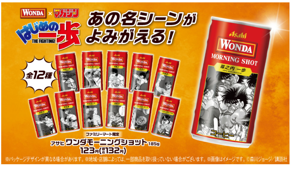 (株)ファミリーマート(東京都港区、細見研介社長)は1月28日(火)から、講談社の「週刊少年マガジン」で連載中の「はじめの一歩」と、アサヒ飲料(株)のロングセラー商品「ワンダ モーニングショット」とコラボレーションした「はじめの一歩×ワンダ モーニングショット ファミリーマートのはじめの一歩缶」本体価格123円を、全国のファミリーマート約1万6200店舗で発売する。