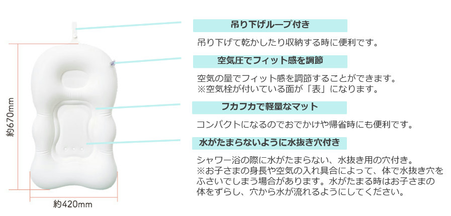 助産師さんの「汚れた水が溜まってしまうことが気になる」「使いおわったあとや乾かす時に吊るせた方が良い」という意見を取り入れ、水抜き用の穴を付け、吊り下げループにはボタンを付けることでバスマット単体で吊るせるようにした。そのほかやわらかい素材を採用することで頭をぶつける心配がなく、耳に水が入りにくいよう頭の位置が高くなる形状にしている。
