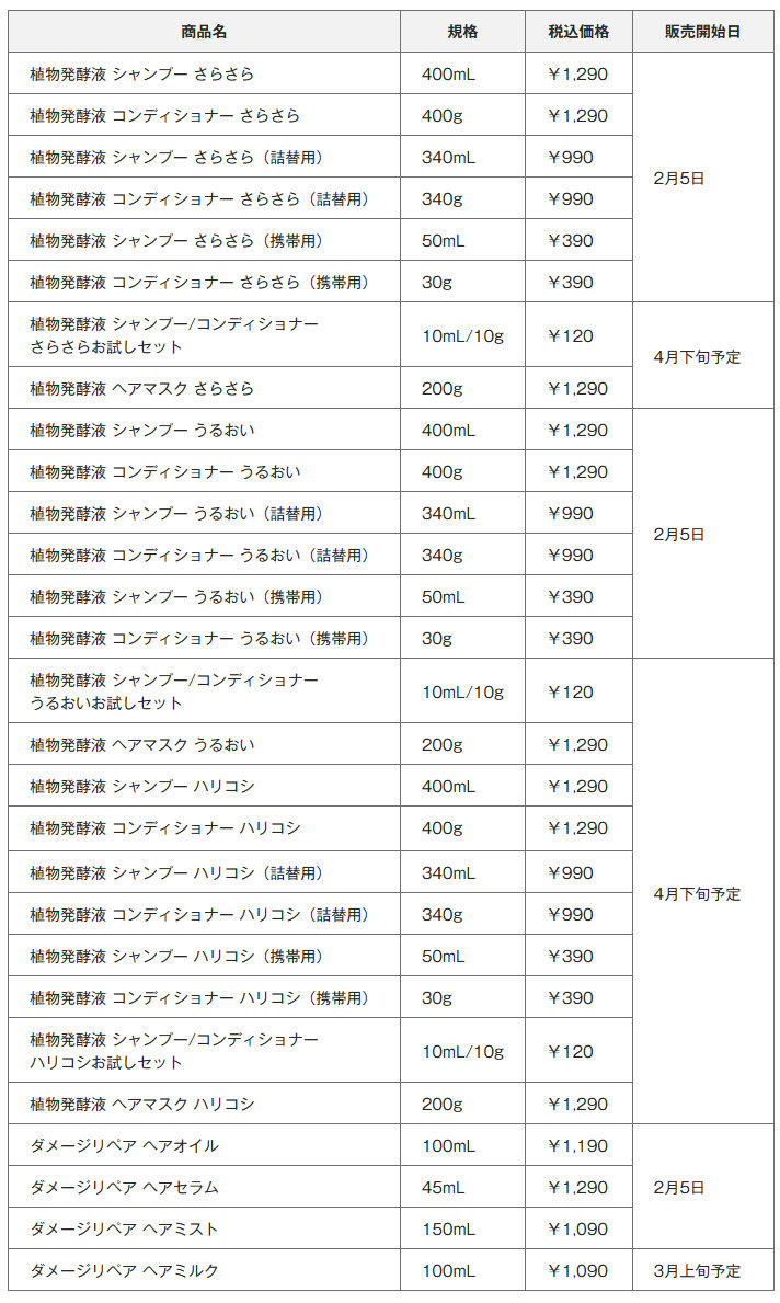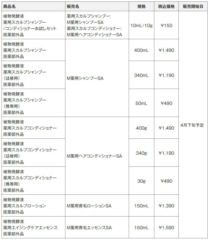 その他に「植物発酵液 ヘアマスク(うるおい・さらさら・ハリコシ)」「植物発酵液 薬用スカルプローション」「植物発酵液 薬用エイジングケアエッセンス」なども発売する。