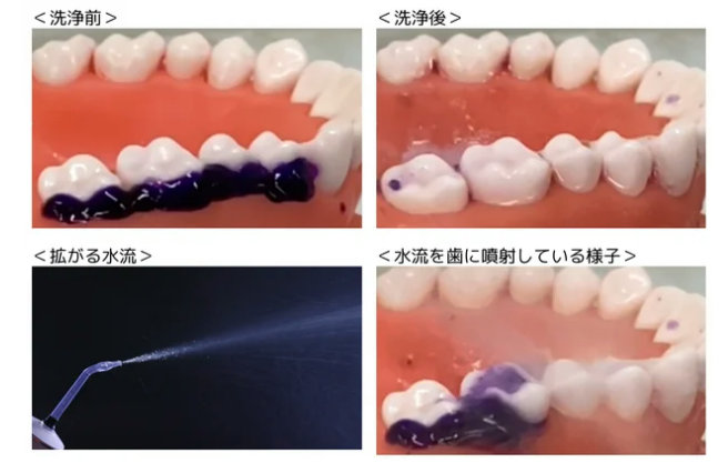 強モードで5cm離れた場所から3秒間噴射した場合の汚れ落ちを比較。※汚れは人工歯垢。