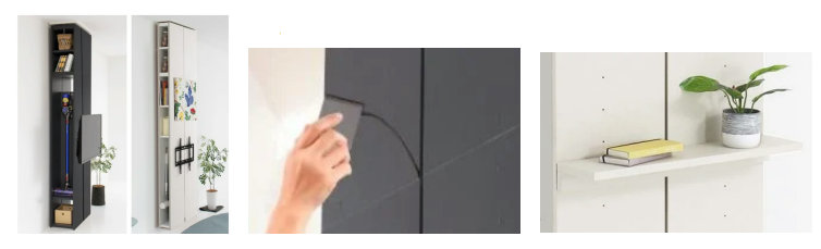 16cmと30cmの2種類の選べる奥行サイズのうち、奥行30cmタイプはスティッククリーナーも入れられる。前面の真ん中のスリットから配線を通し収納内部に収まるため、配線の気になるゴチャつきも解消。さらに、前面にある壁掛け金具の取り付け穴を利用して、好みの位置に固定できる可動棚も別売りで用意しており、フォトフレームや花瓶など、ちょっとしたものを飾るのに便利だ。