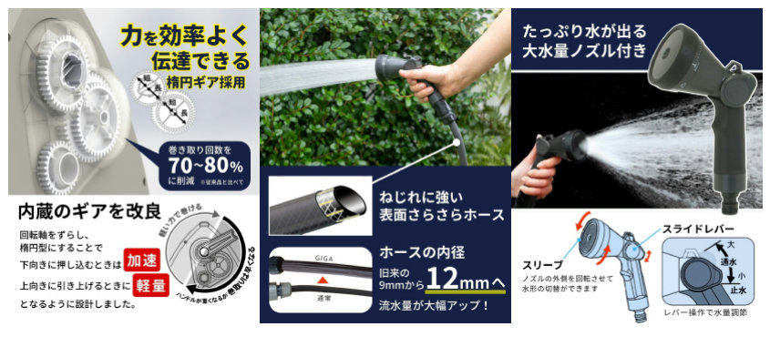 昨年発売したホースリール「ギアスピードギガ 20m」は、巻き取りの速さと、大水量で好評だ。ギガシリーズの特長は3つ。1つ目は、楕円ギア採用で力を効率よく伝達できるため、ホースをより早く巻くことができる。2つ目は、ホースは表面がさらさらでねじれに強く、内径は12mmで大水量。3つ目は、ノズルはたっぷりと水が出る大水量ノズルを採用(コメリギアスピード比較:流量約2倍)。