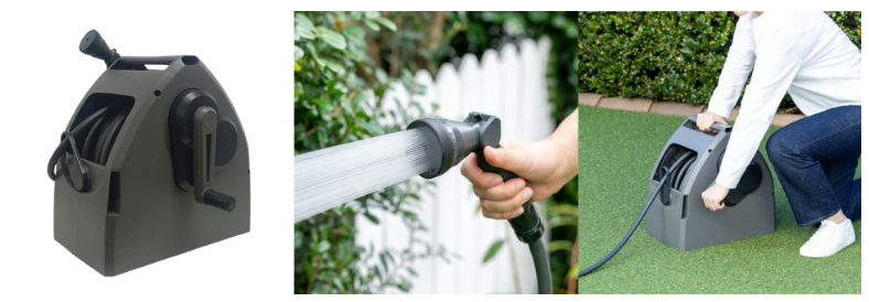 「Breezy Green ホースリール ギアスピードギガ 30m」は、蛇口から遠い場所での作業や、畑仕事に最適な商品。サイズは約幅36.4cm×奥行42cm×高さ41.7cm、単品重量は約6.4kg、ホースの長さは30m、ホース内径は12mm。税込価格5980円(以下同)。