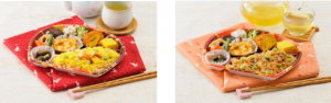 主食はほっき飯と鶏五目ご飯の2種類で、それぞれ煮物(椎茸・人参・蓮根・いんげん)、手づくりグラタン、かぼちゃコロッケ、青さ入り玉子焼き、相馬きゅうり漬けを添えた弁当。本体価格580円。