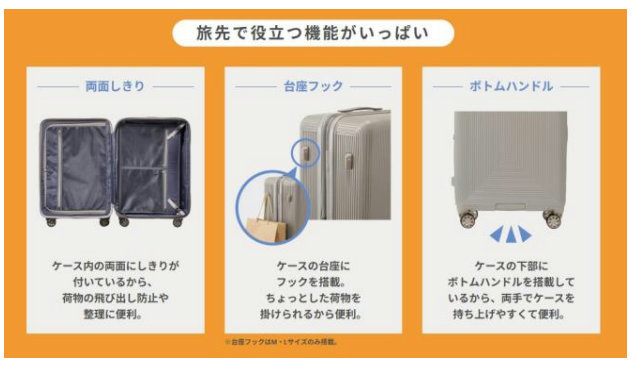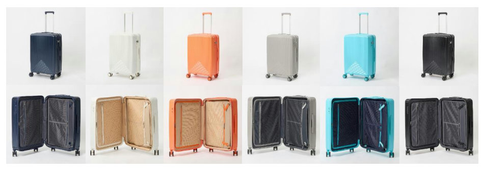 イオンリテールは大型連休の旅行や出張に向け、ブラック、ネイビー、ホワイト、グレーのベーシックカラーに、サックスブルーとオレンジのキーカラーを加えたカラフルな6色のキャリーケースを展開する。ケース内部も外側と同じカラーリングで合わせている。