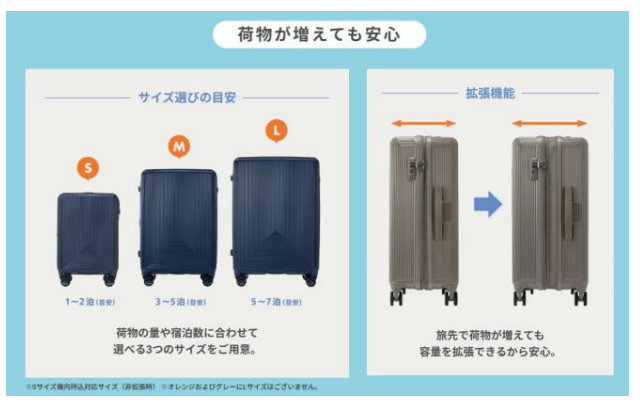 荷物の量や宿泊数に合わせて、3サイズを展開。本体外装のファスナーを開けると奥行きを拡張することができる。拡張サイズは、Sが奥行き23㎝→拡張時25.5㎝、Mは26.5㎝→29.5㎝、Lは28㎝→31㎝に拡張可能だ。