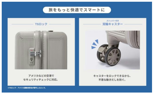 そのほか、ケースの鍵はアメリカ運輸保安局が認可したTSロック。また、キャスターをロックできるので、揺れる電車内などでも対応可能だ。