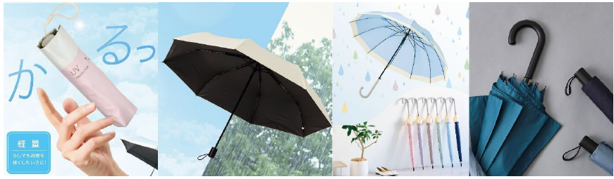 晴雨兼用傘は軽量タイプ・コンパクトタイプ・耐風骨仕様・自動開閉仕様4タイプで好みやシーンに合わせて選べる。また99.99%以上の1級遮光・99.9%のUV遮へい率・遮熱効果の生地を使用している。はっ水効果も施してある。
