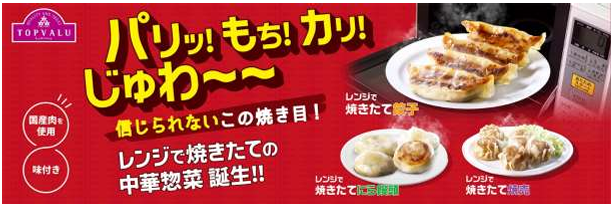 3月6日(木)に「トップバリュ レンジで焼きたて」中華惣菜シリーズから、電子レンジ加熱するだけでフライパン調理をしたような、こんがり焼き目がつく「トップバリュ レンジで焼きたて 餃子」など「トップバリュ レンジで焼きたて 餃子」、「トップバリュ レンジで焼きたて にら饅頭」、「トップバリュ レンジで焼きたて 焼売」の3品目を発売する。価格は198円税抜き 以下同)。