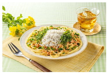 「国産釜揚げしらすと小海老のオイルパスタ」は、ふんわりとした食感のしらすと春らしい彩りの大葉と小海老が相性抜群のパスタ。550円。