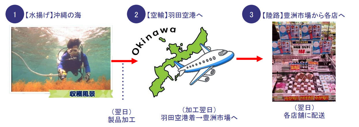 通常、もずくは水揚げされた後に鮮度を保つために冷凍や塩漬け処理を行うが、「沖縄産 生もずく」は水揚げ後、航空機を使って採れたての鮮度が高いまま直送し、3日後には東武ストア各店に届く。