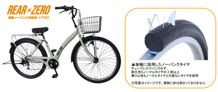 発売する27.5型軽快車「リアゼロ」は、商品名の通り「リア(後部)」のパンクが「ゼロ」の自転車となる。パンクリスクの多い後輪は絶対にパンクしないノーパンクタイヤ、前輪はハンドル操作も軽いノーマルのワイドタイヤ仕様となる。