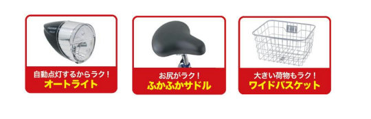 「ライト」は、手動ON・OFFからオートライトへ変更。自動点灯で点灯忘れや摩擦音、ペダルが重くなることがなくなり快適に。「サドル」は、肉厚サドルに変更し、座り心地が向上し、お尻への負担が軽減される。「カゴ」は、ビジネスバッグも入るワイドバスケットに変更し、積載量が約2kgアップした。買い物や部活動での大荷物でもラクラク収容が可能だ。